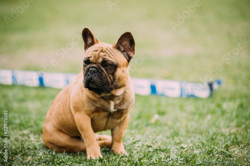Obraz premium Young Brown French Bulldog Dog Sitting In Green Grass, In Park O