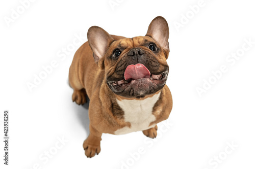Obraz premium Young brown French Bulldog playing isolated on white studio background