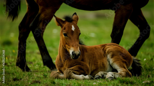 © Abdullah, Fototapeta premium Young Brown Horse Lies Down in Green Meadow Under Its Mother