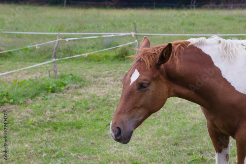 Fototapeta premium Young brown horse on grass background, left is a place for writing text