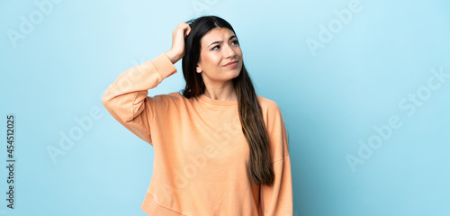 © luismolinero, Fototapeta premium Young brunette girl over isolated blue background having doubts while scratching head