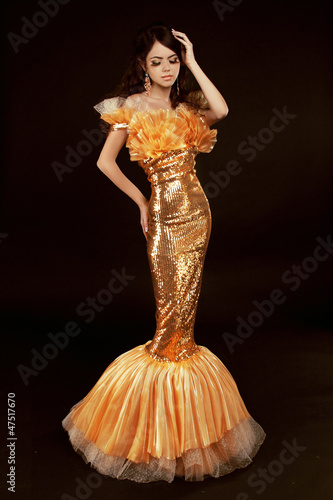 © Victoria Andreas, Fototapeta premium Young brunette lady in golden gorgeous dress posing on black bac