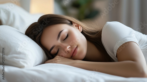 Fototapeta premium Young brunette sleeps calmly in bed - good bedding and mattress for a good sleep