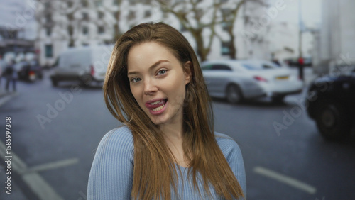 © Krakenimages.com, Fototapeta premium Young brunette woman in blue sweater sticks tongue out on busy street amid moving cars; playful mischief.