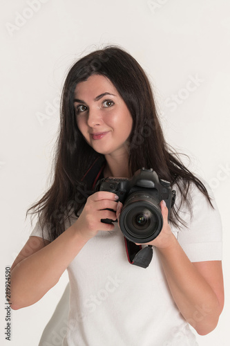 Fototapeta premium Young brunette woman - professional photographer with DSLR camera on white...