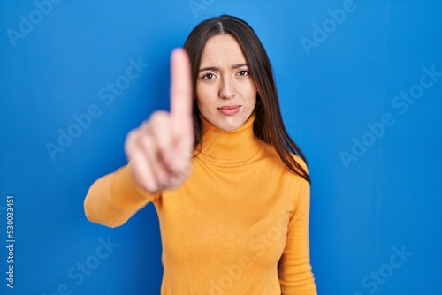 Fototapeta premium Young brunette woman standing over blue background pointing with finger up and angry expression, showing no gesture
