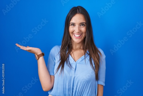 Fototapeta premium Young brunette woman standing over blue background smiling cheerful presenting and pointing with palm of hand looking at the camera.
