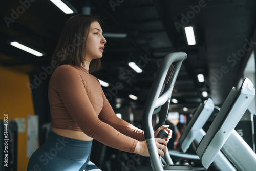 © Galina Zhigalova, Fototapeta premium Young brunette woman training for cardio equipment at fitness club gym