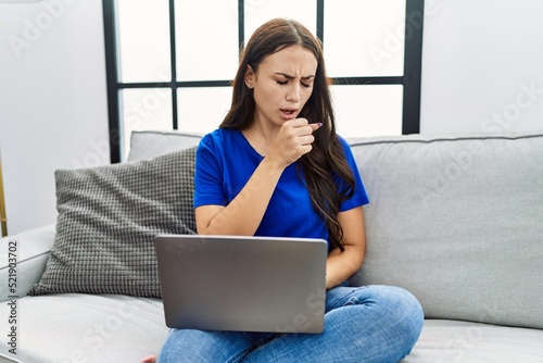 Fototapeta premium Young brunette woman using laptop at home feeling unwell and coughing as...