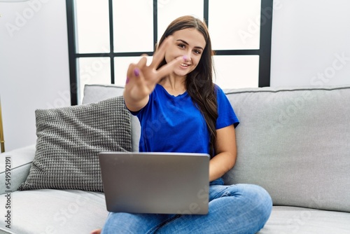 Fototapeta premium Young brunette woman using laptop at home smiling looking to the camera showing fingers doing victory sign. number two.