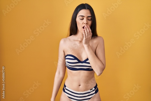 © Krakenimages.com, Fototapeta premium Young brunette woman wearing bikini over yellow background bored yawning tired covering mouth with hand. restless and sleepiness.