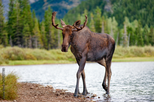 Fototapeta premium Young Bull Moose walking from lake
