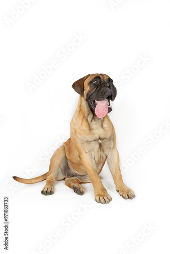 © eds30129, Obraz premium young bullmastiff sitting with tongue out isolated on white background