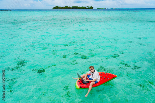© Igor, Fototapeta premium Young business boy. child in glasses works on a tropical island.