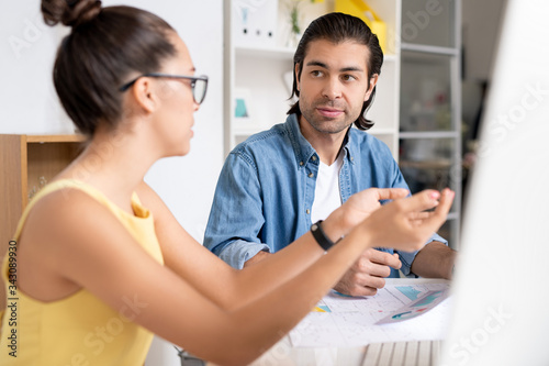 Fototapeta premium Young business colleagues sitting at table in office and analyzing papers while discussing statistical data