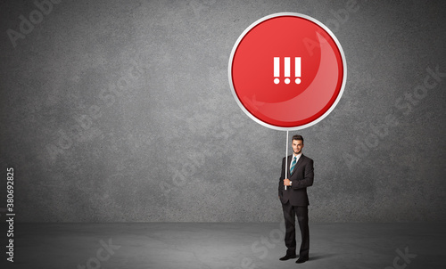 Obraz premium Young business person holdig traffic sign with !!! abbreviation, technology...