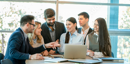 © Bojan, Obraz premium Young business team discussing project details around laptop in bright office