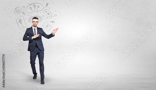 Fototapeta premium Young businessman in suit fighting with doodled symbols concept