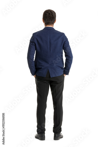 Fototapeta premium Young businessman on white background, back view