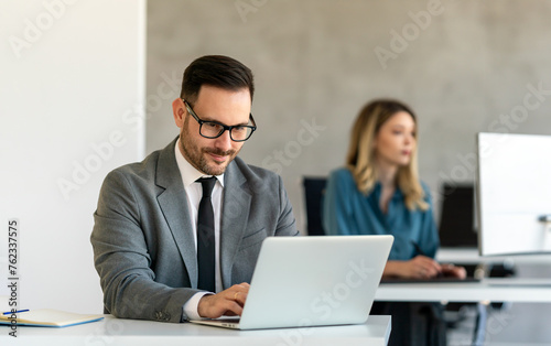 © NDABCREATIVITY, Obraz premium Young businessman using laptop computer in office. Manager thinks about successful financial ideas.