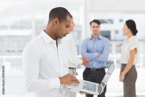 Fototapeta premium Young businessman using laptop with team behind him