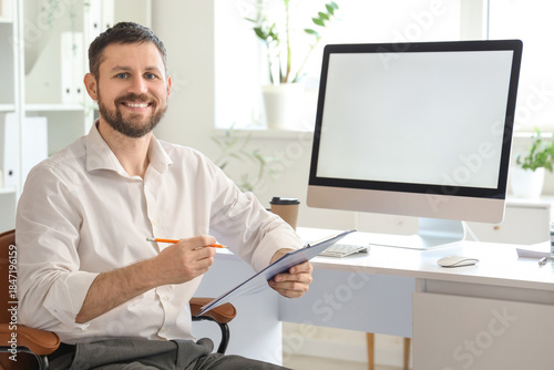 Naklejka premium Young businessman working with clipboard and blank computer at table in office