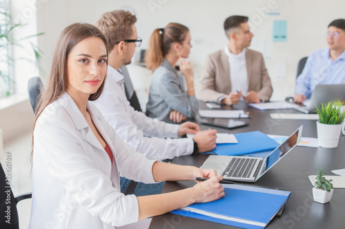 © Pixel-Shot, Obraz premium Young businesswoman during meeting in office