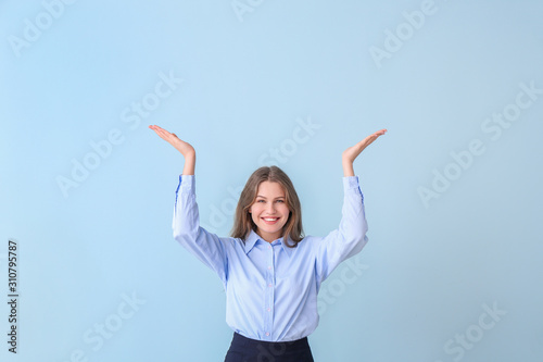 Fototapeta premium Young businesswoman on color background