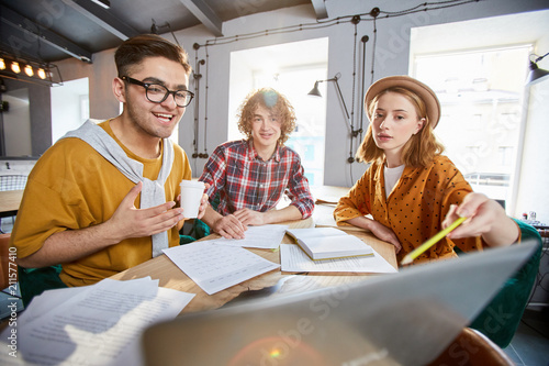 © pressmaster, Obraz premium Young businesswoman pointing at data on laptop display while explaining it to colleagues at working meeting