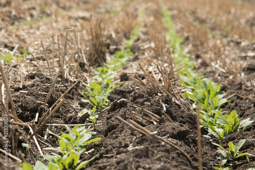 Fototapeta premium Young camelina crop with shallow depth of field on a farm in Saskatchewan, showing the practice of seeding into last years stubble