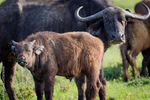 © Jo, Fototapeta premium Young cape buffalo calf stands next to mother
