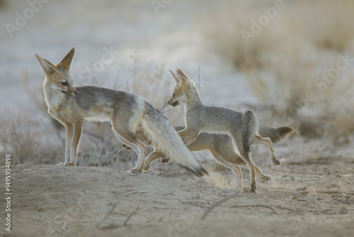 Obraz premium Young Cape fox puppy interacting with its family in the arid Kalahari Desert