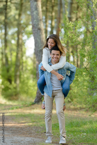 Obraz premium young carefree couple piggybacking and having fun among the trees