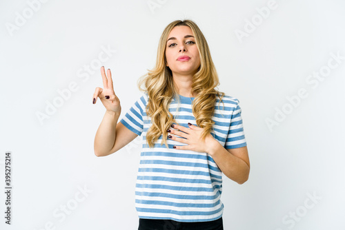 Fototapeta premium Young caucasian blonde woman taking an oath, putting hand on chest.