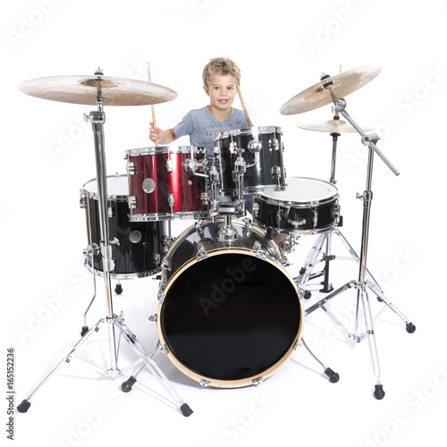 © ahavelaar, Fototapeta premium young caucasian boy plays drums in studio against white background