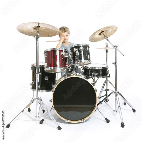 © ahavelaar, Fototapeta premium young caucasian boy plays drums in studio against white background