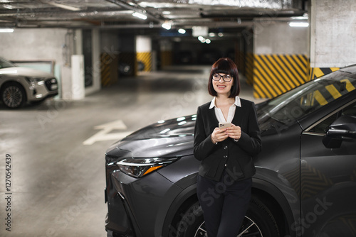 © sofiko14, Fototapeta premium Young Caucasian business woman in office attire using smartphone in indoor car park, leaning against car with confident expression, emphasizing communication and modern lifestyle in urban setting.