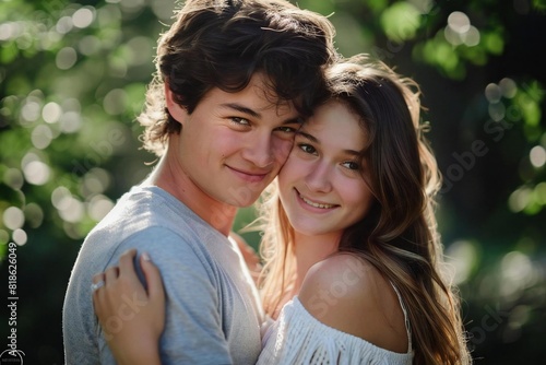 © Yuliia, Fototapeta premium Young Caucasian Couple Embracing in the Park