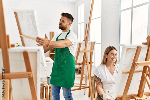 Obraz premium Young caucasian couple smiling happy drawing at art studio. Man standing and holding canvas.