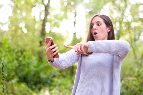 © Gerard, Naklejka premium Young caucasian european brunette girl pointing her cellphone very surprised in the forest or nature