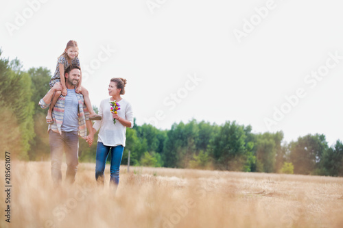 Fototapeta premium Young Caucasian family walking across field with young child on her fathers...