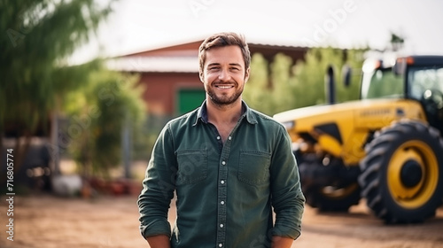 Naklejka premium Young Caucasian farmer Use a tractor to work in the garden.