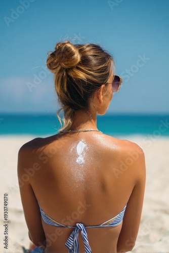 Obraz premium Young caucasian female relaxing on sunny beach with sunscreen