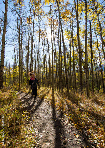 © tslphoto, Fototapeta premium Young caucasian female running through golden aspen trees on a beautiful fall day