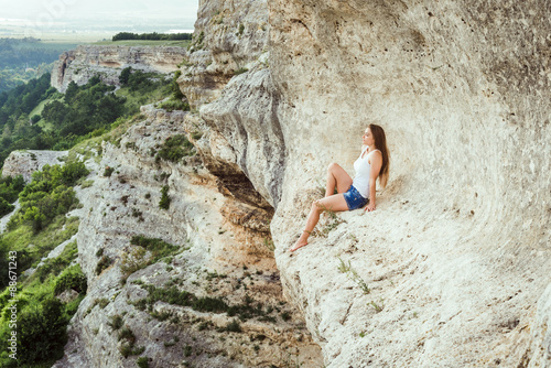 Fototapeta premium young caucasian female sitting on a cliff and looking at view in crimea mountains