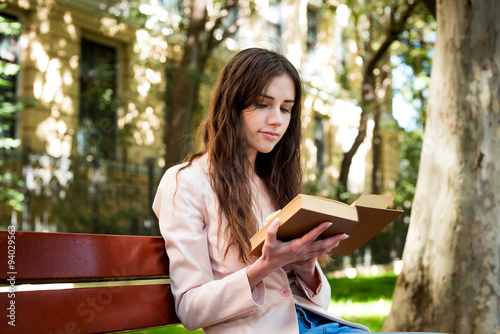 © kurapatka, Obraz premium young caucasian female student reading a book on campus, student study in campus area