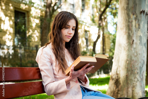 © kurapatka, Obraz premium young caucasian female student reading a book on campus, student study in campus area