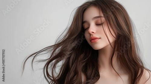 Naklejka premium Young caucasian female with flowing hair and serene expression