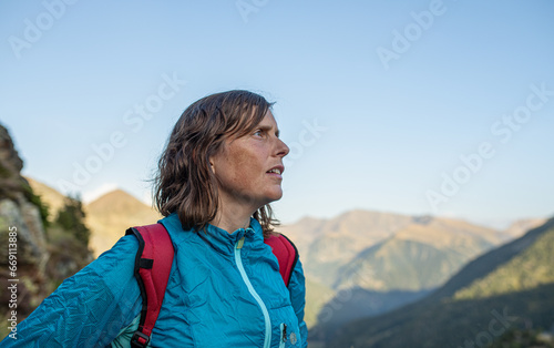 © Alexandre Arocas, Naklejka premium young caucasian girl looking at the horizon from the mountains of andorra