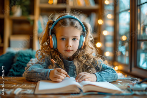 Obraz premium Young Caucasian girl studying at home with headphones on